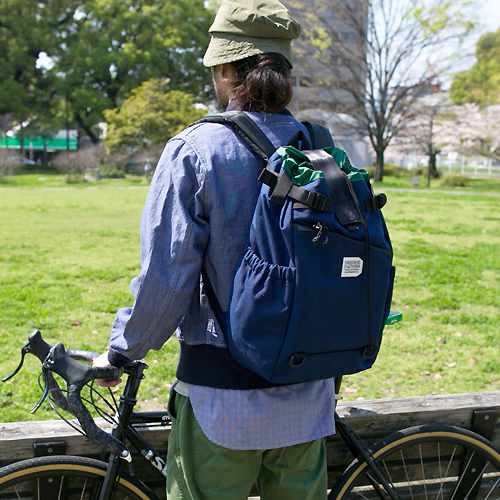 クラシックな巾着仕様。50mm幅のシートベルトテープベルクロ止め。