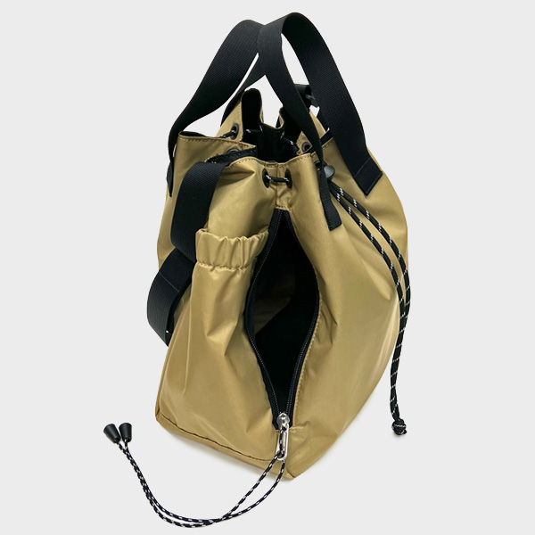 トップ部分の巾着に加えて、サイドファスナーからも荷物へアクセス。