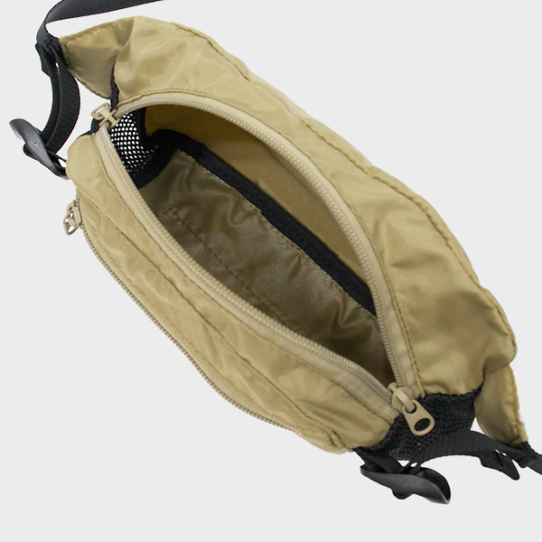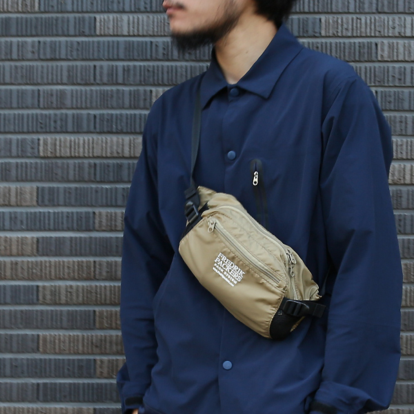 立体的なパターンとスポーティな印象が特徴のヒップパック。210D OXFORD NYLONで軽量。