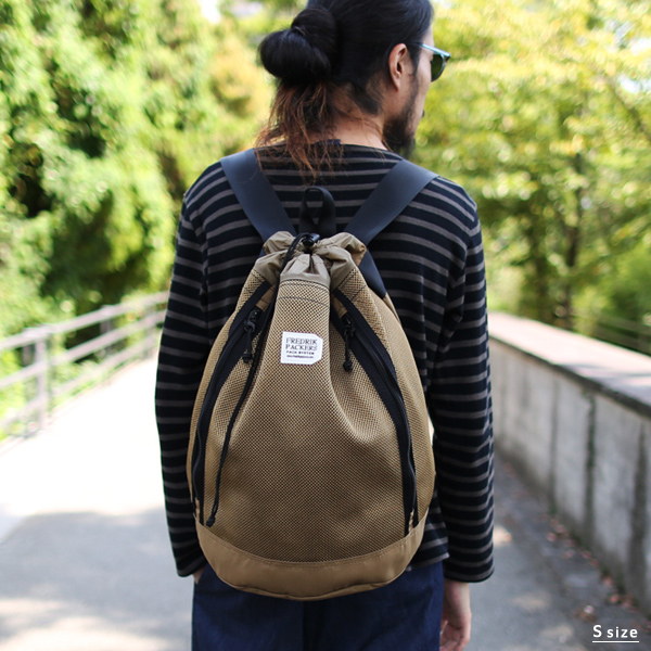 トップ部分は巾着仕様で一周<S>80cm / <M>90cmの開口部は大きな荷物の出し入れに対応。