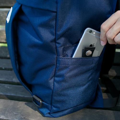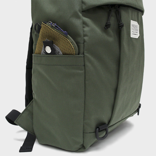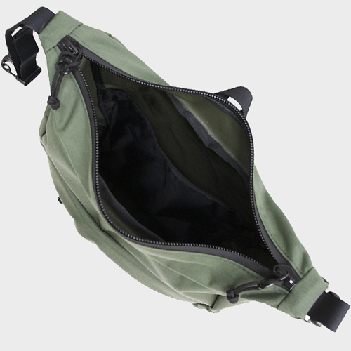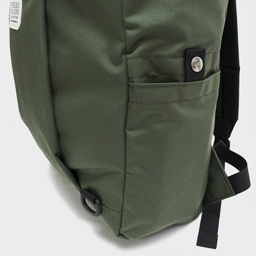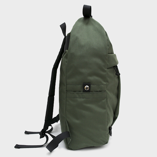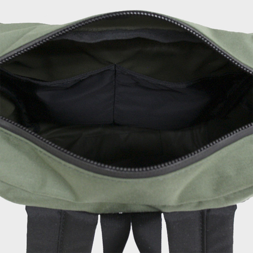 10コイルファスナーでスムーズな開閉。両サイドにドットボタン留めのマチなしポケットを装備。