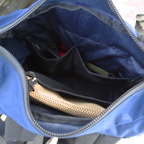 背面側に薄い物の収納に便利な深さ34cmのマチなしポケット。フロント側に細かい物の収納に適した深さ20cmで5cm幅のマチ付きダブルポケット。