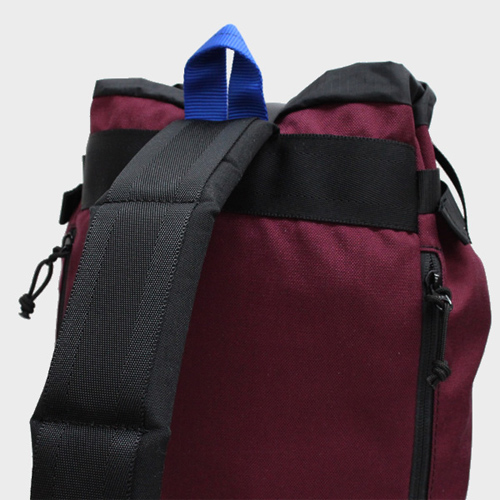クラシックな巾着仕様。50mm幅の二つ山織りテープベルクロ止め。両サイドに5コイル裏使いファスナーを装備。荷物へのアクセスも容易。フロントの内側に深さ21cmの仕切り布。