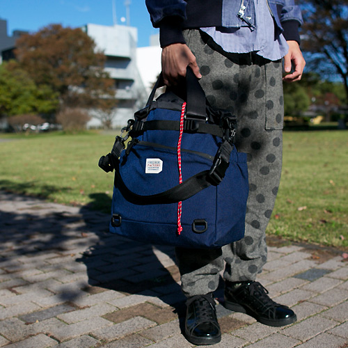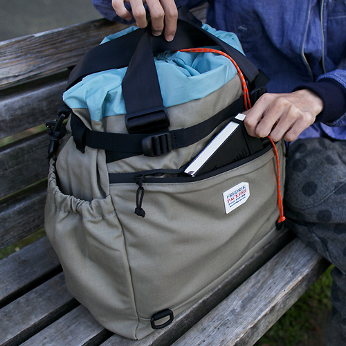 クラシックな巾着仕様。両サイドに深さ<S>25cm、<M>29cmのサイドポケット。
